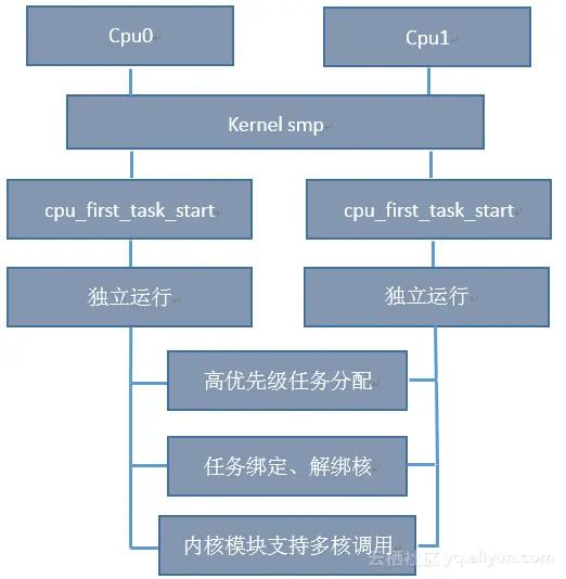 内部实现需要完成剩余核的复位启动、必要硬件的初始化,并在从属核初始化完后,同样进入cpu_first_task_start开始进入调度;此阶段,0核需要执行os_wait_allcore接口来等待所有核的启动完成,以所有核都能进入idle任务为启动完成标志。os_wait_allcore为通用实现接口,cpu_first_task_start同单核实现。
