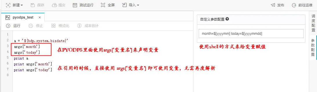 请注意:在数据开发下,使用了自定义调度参数,页面上直接触发运行PYODPS节点时,需要写死时间,PYODPS节点无法像SQL一样直接替换。