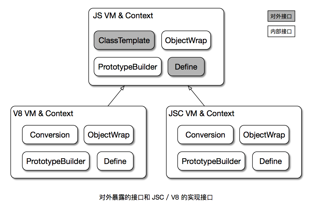 JSContext 为 JS 引擎的控制上下文,同时是一个模板类,其中包含全局对象 Global,对于真正的 V8 和 JSC 的操作由其实现类 V8Context 和 JSCContext 决定。而与 JS 通信主要使用对外接口 ClassTemplate 和内部接口 ObjectWrap。