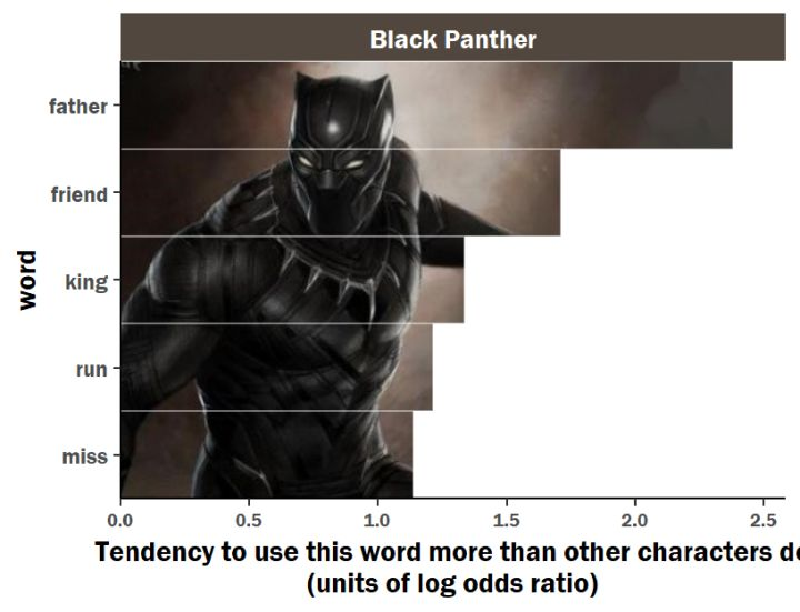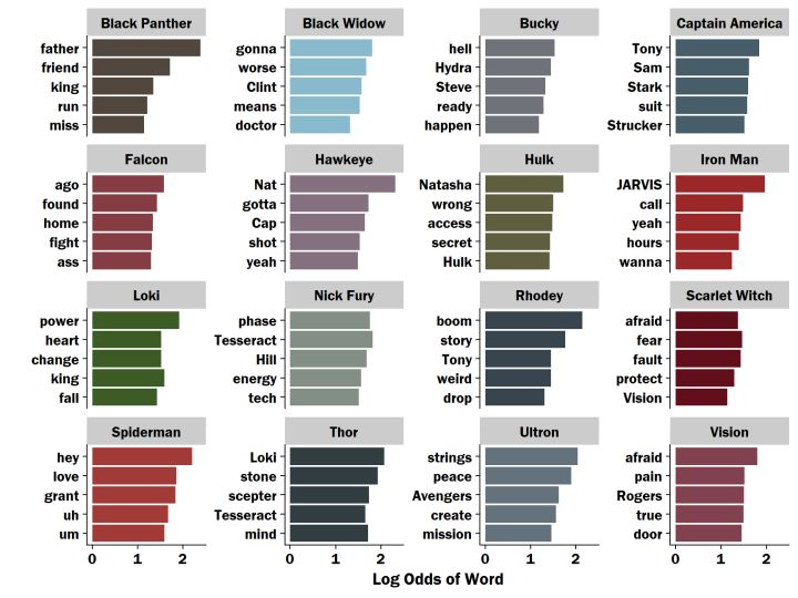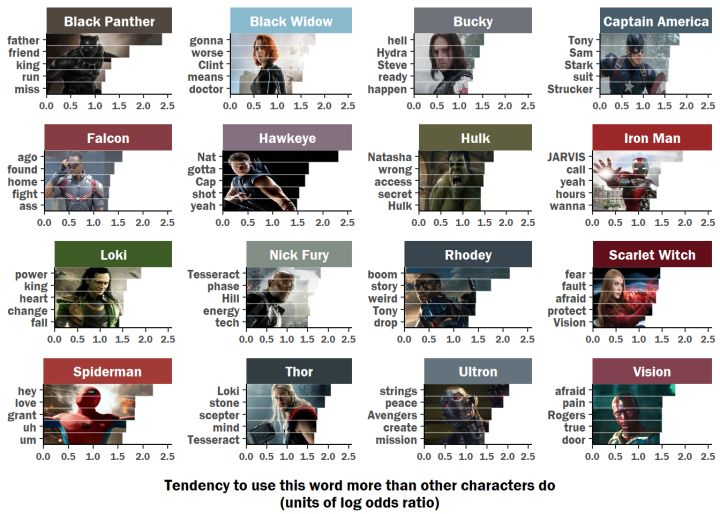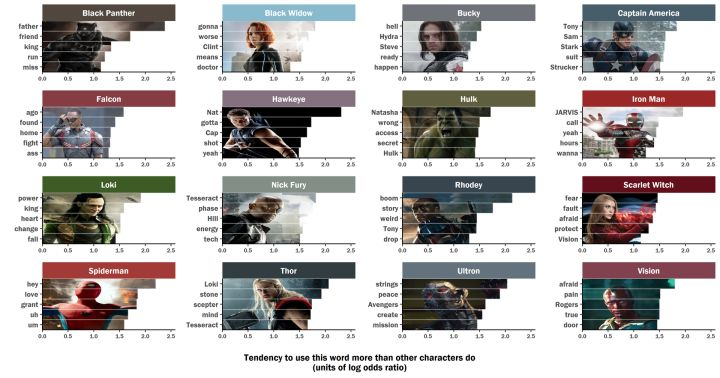 国外有几位漫威的铁杆粉丝把每个复仇者的说话习惯用 R 语言可视化了出来,图中每个词对应的条形长度,代表了他比其他复仇者更爱说这个词的程度。