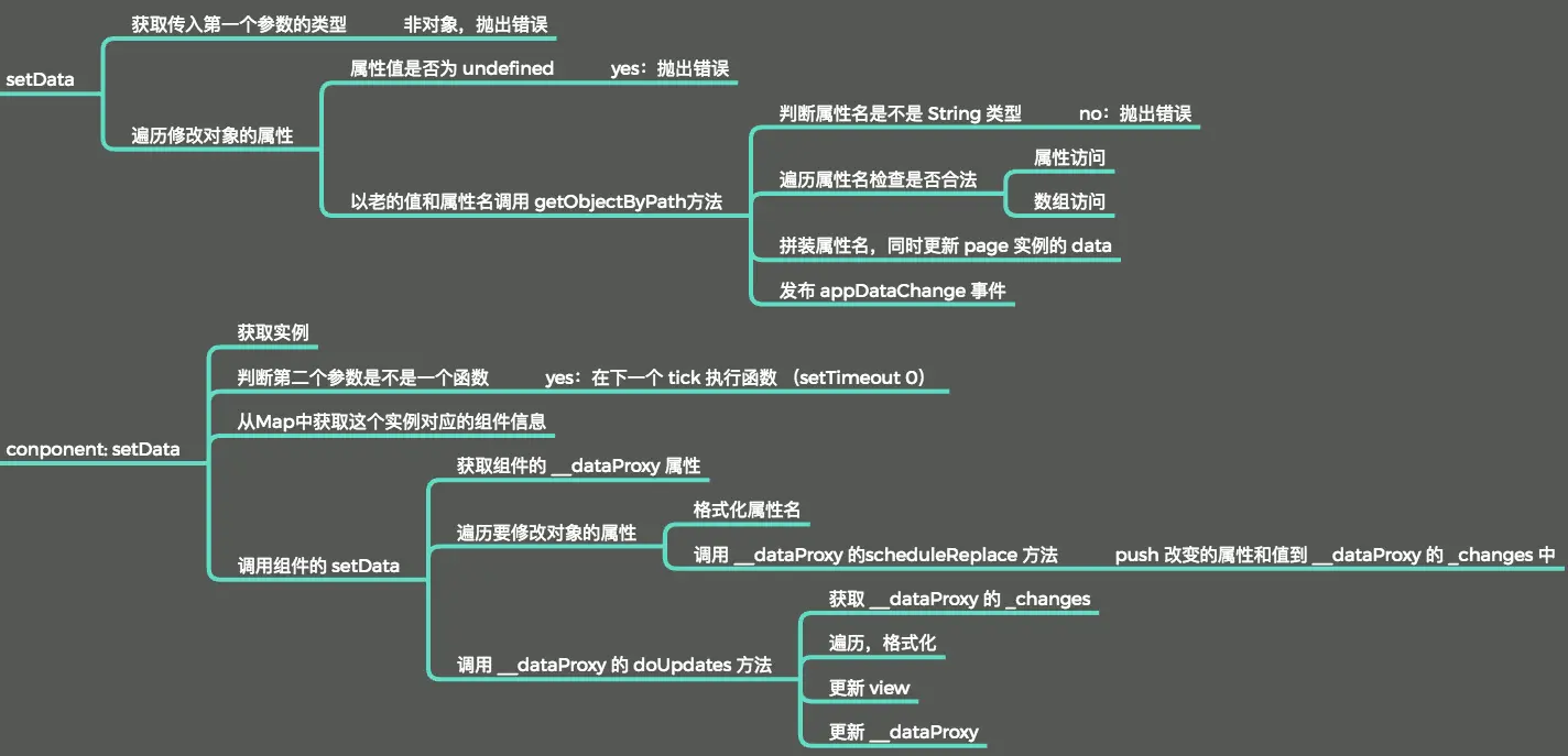 小程序框架是一个以数据驱动的框架,当然不能少了对他如何实现数据绑定的探索,下图是 Page 实例的 setData 执行流程: