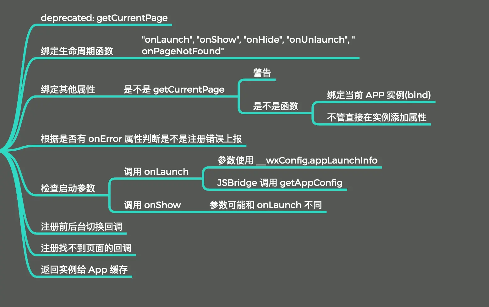 一份在调试过程中的笔记 小程序框架不完全分析.xmind,如果看官有兴趣可以下载看看。当然最后对于框架中已有的能力,还是非常希望微信可以开放更多稳定的接口,并在文档中告知开发者,让开发变得简单一些。