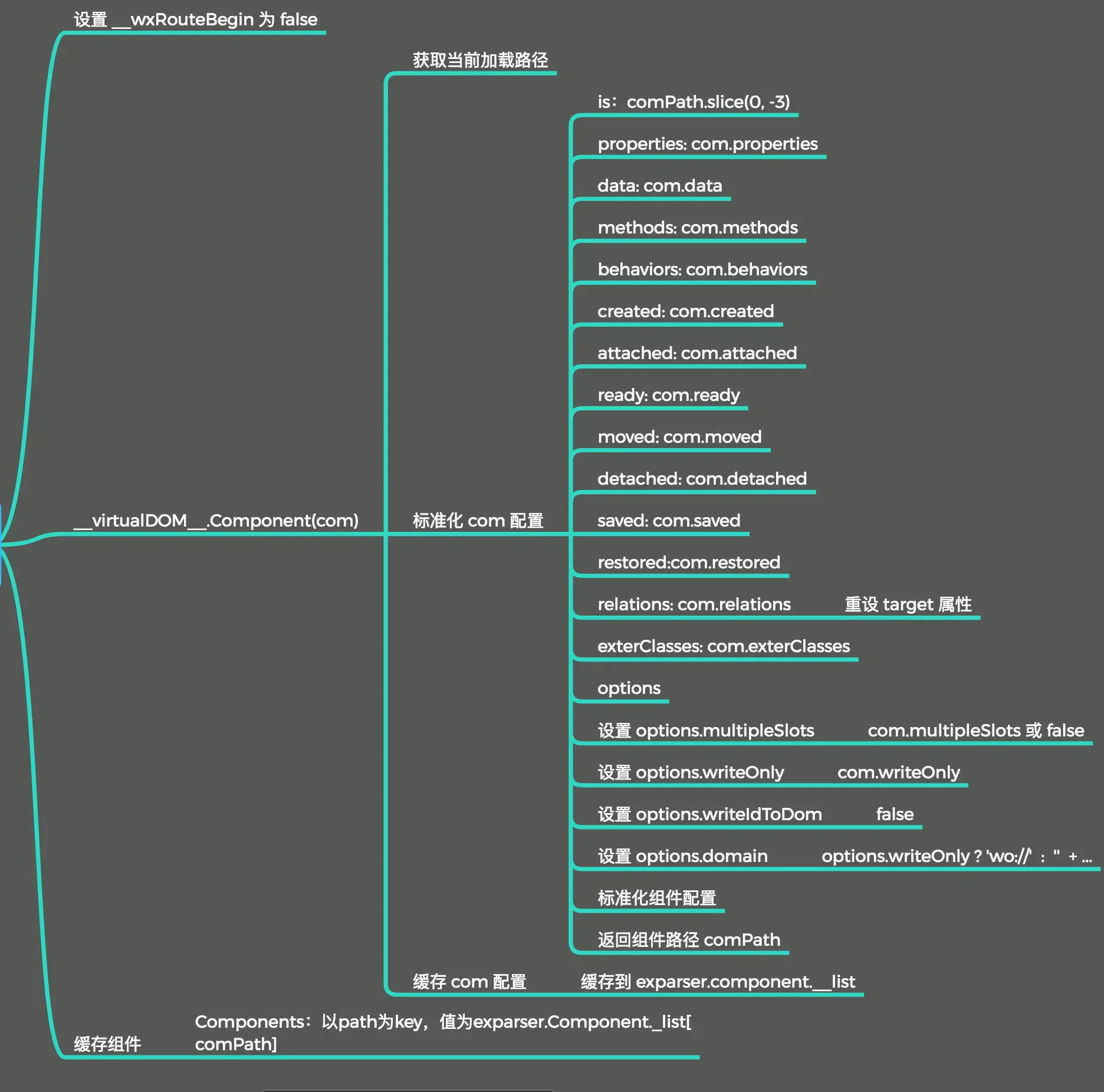 图中介绍了框架如何对传入 Component 方法的对象的处理,其后面还有很多深入的对于组件实例化的步骤没有在图中表示出来,具体可以在文章最后的附件中查看。