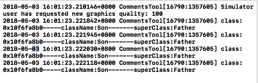 NSLog(@"class:%p-----className:%s-------superClass:%@\n",currentClass,className,[currentClass superclass]);