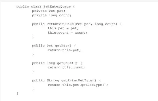 我们实现的队列其实是 Petenter Queue类的实例。大体说来,首先有一个不断累加的数据项,用来表示实例进队列的时间;同时有两个队列,一个是只放dog类实例的队列dogQ,另一个是只放cat类实例的队列catQ。