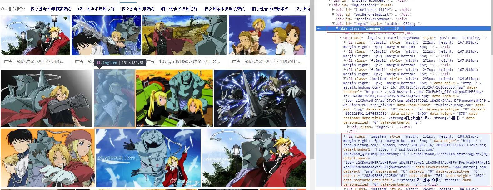 看了下网页的结构,信息都在一个叫imgpage的class里面,而它的children里面,class是imgitem就是我们所需要的~ 看了下,imgpage并不是唯一,但里面的内容都是我们需要的,因此我们需要提取所有class叫imgpage的内容