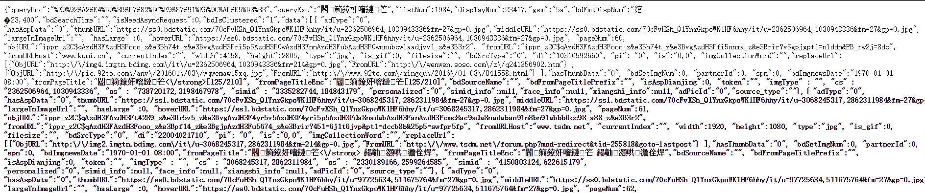 在里面直接搜索图片的下载关键字,比如thumbURL,发现在能这个网页上查询到,并且图片正常,记下来就是直接用文本提取就好了
