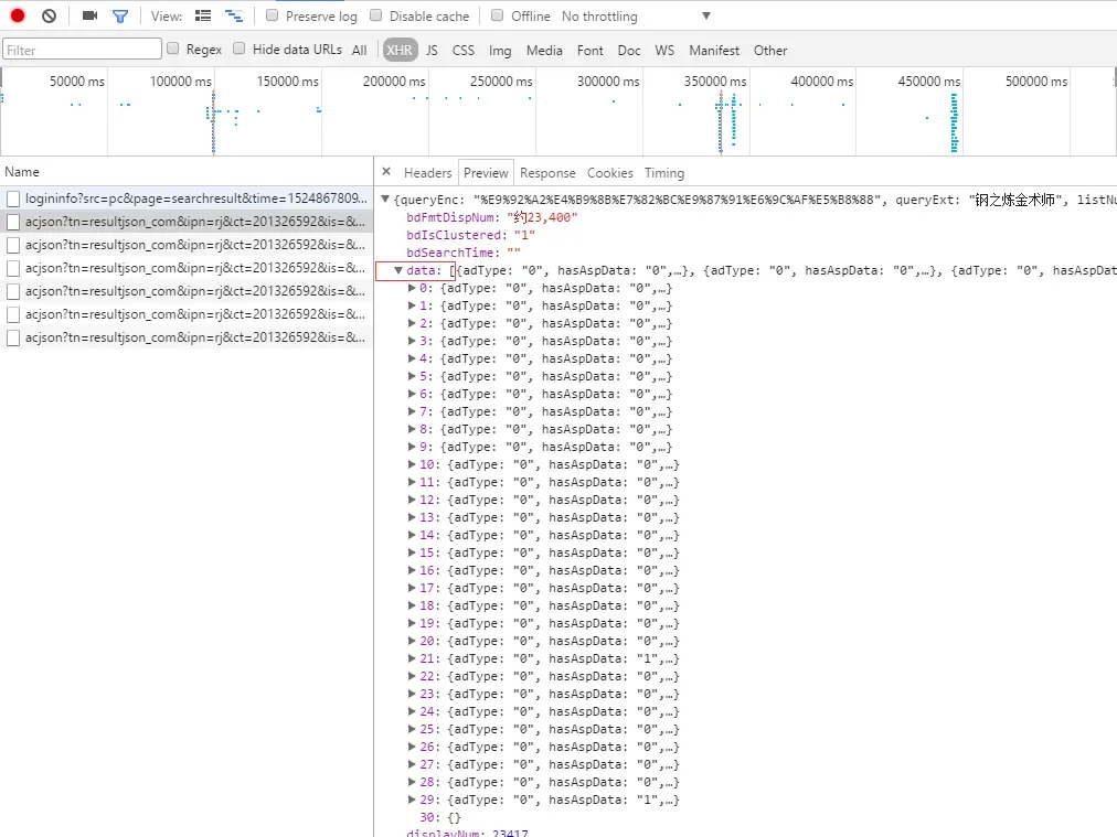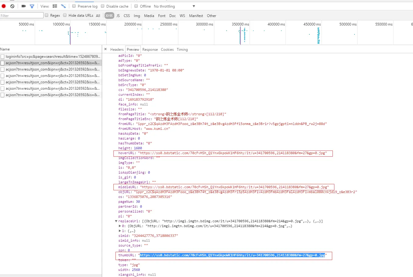 因此明白了,Chrome的XRH是用来记录ajax的请求,而百度图片用的就是ajax,因此就是这XRH看数据了~
