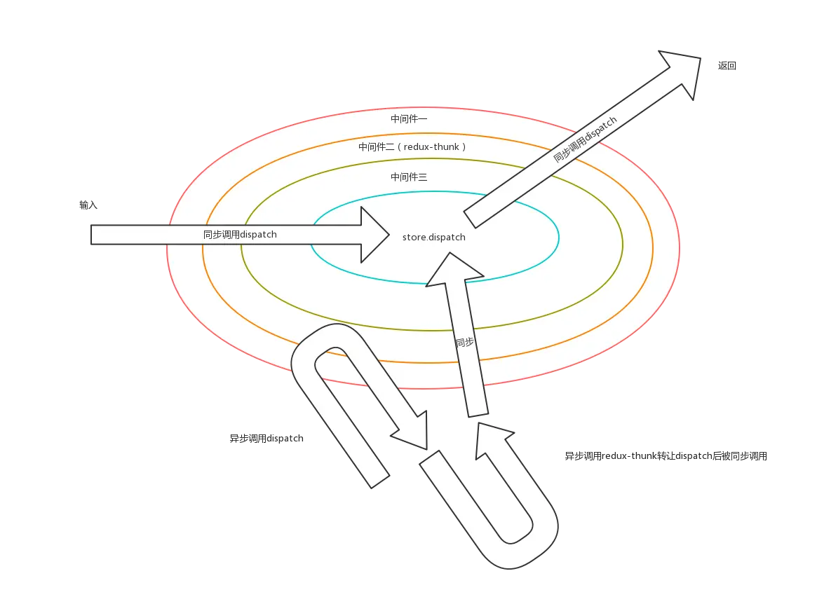 接受action作为参数的函数,并且自身同样返回一个包含中间件具体操作的接受action作为参数的函数。 - 由中间件提供的dispatch被调用,中间件被依次调用,如果遇到提供了异步支持,那么在异步情况下,dispatch会先按照普通流程调用,当遇到redux-thunk或者redux-promise等函数时,会以同步的形式重新调用当前dispatch(中间件也会被重新调用一遍)