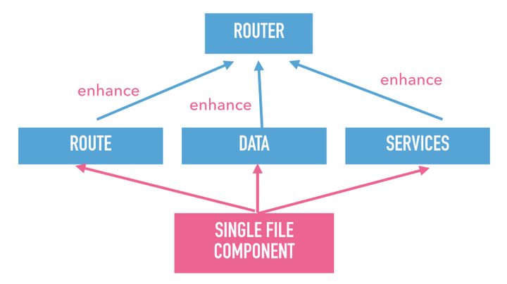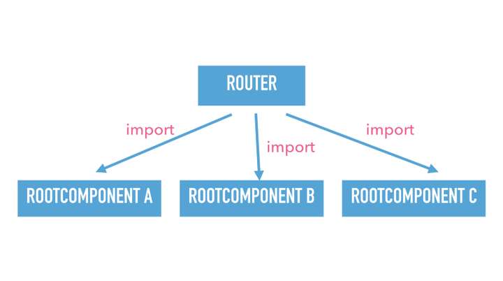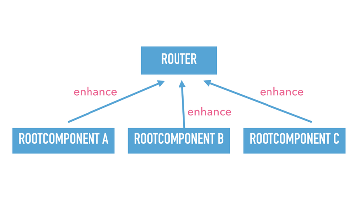 看看依赖关系图发生了什么,组件保持不变,但箭头指向相反的方向。因此,根组件会对路由使用 enhance 方式来声明自己,以取代让路由 import 根组件的方式。这意味着当我删除根组件时我仅需要删除相应文件即可。因为它不再 enhance 路由,当我们删除组件时,这是唯一需要做的操作。