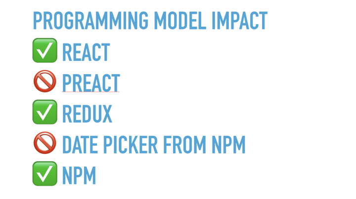 我想举几个影响编程模型(同后文提到的开发应用一词)的例子:假设你有一个 Angular 项目,然后你说“我准备把它移植到 React 上”,这显然会改变我们开发应用的方式,对吧?接下来你可能会说“啊,为了实现虚拟 DOM 操作就要浪费 60KB,让我们换到 Preact 吧”,这是一个兼容 React API 的库,它不会改变我们开发应用的方式。也许不久又你会觉得“这真的很复杂,我应该用一些东西来管理我的应用状态,我准备引入 Redux”,这将会改变我们开发应用的方式。然后你收到一个需求:“我们需要一个日期选择器”,你在 npm 上查到了近500个结果,你选了一个。选择哪个很重要么?它绝对不会改变你开发软件的方式。但由于 npm 触手可及,其中包含有庞大的模块库,这绝对已经改变了你开发应用的方式。当然,这些只是可能影响到人们开发应用的几个例子。