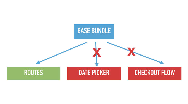 举个例子。你的基础 bundle 需要依赖于具体路由,因为当你从 A 跳到 B 时,你需要确保路由对于 B 能正确处理。但是你并不想在基础 bundle 中放入任何形式的 UI 代码,因为对于用户来说,不同的进入方式会产生不同的用户界面。举个例子,日期选择器就绝对不应该放在你的基础 bundle 中,结账流程(指图中 CHECKOUT FLOW 组件)也不应该。所以该怎么做呢?不幸的是 import 非常脆弱。你可能无意中引入了很酷的 util 包,只因为它包含生成随机数的函数。然后有人说:“我需要一个用于自动驾驶汽车的工具”,你便立刻将用于自驾车的机器学习算法引入到你的基础 bundle 中。类似的事情很容易发生,因为引入(其他包)是具有传递性的,这些东西随着时间的推移而累积在一起。