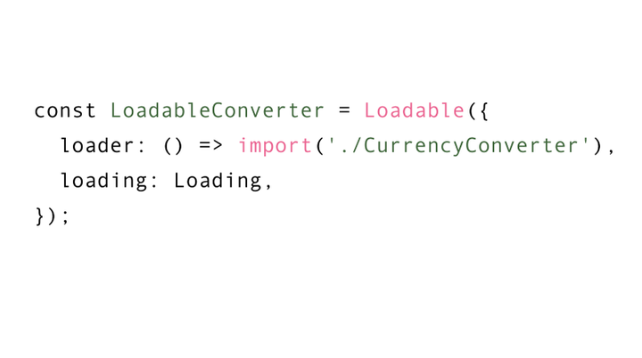 如果你想延迟加载它,你会这样写:使用动态 import——一个新奇的延迟加载 ES6 模块的方法,将 import 包装在一个可加载组件中。当然,可以有成千上万种方法做到这点,我并不是 React 专家,但所有这些方法都会改变你开发应用的方式。