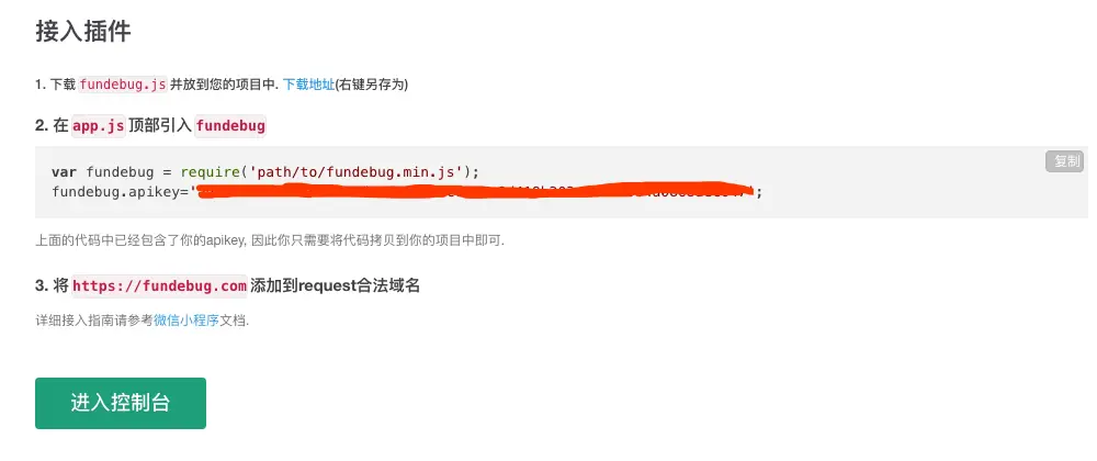 Fundebug的小程序监控插件接入简单,只需要下载相应的插件文件,然后在app.js文件中引入并配置apikey即可。唯一要注意的就是微信需要设置request合法域名这一点不能忘记了。