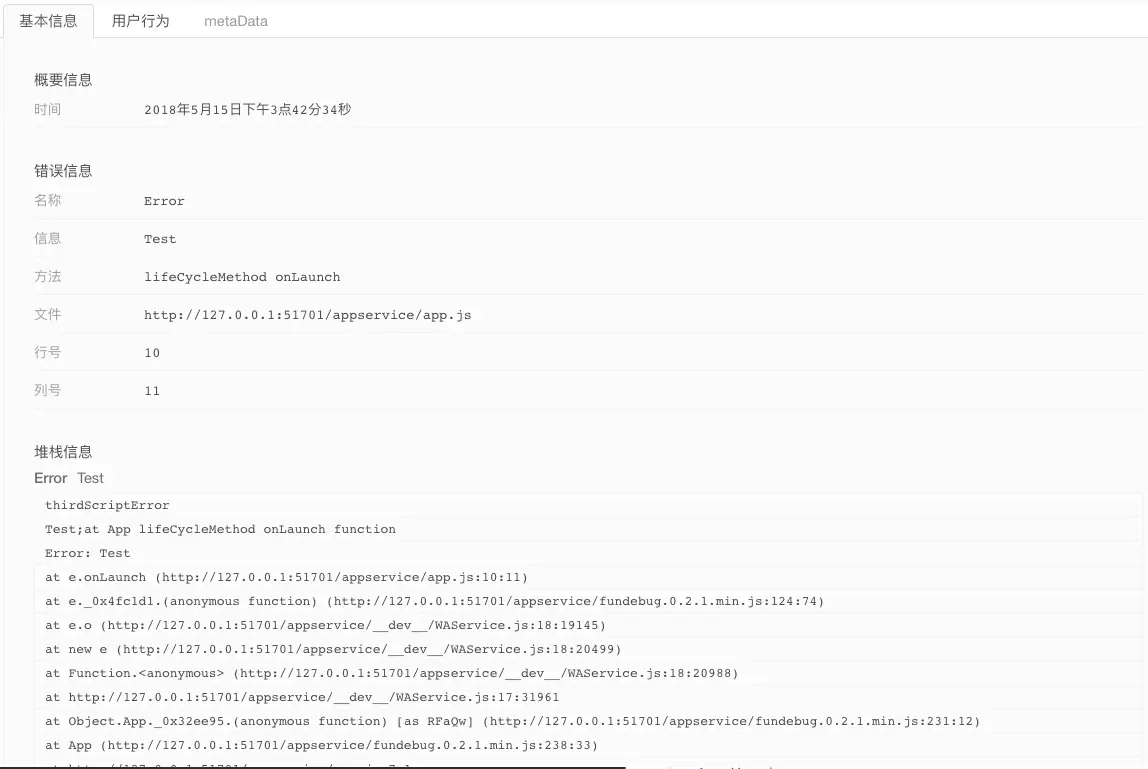 然后,在Fundebug的控制台就可以看到详细的错误信息了