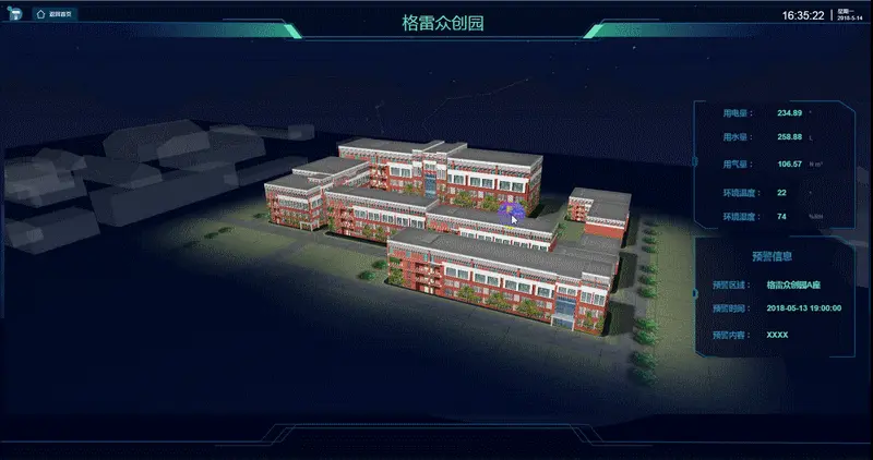 这个 gif 图中显示的是一个 2D 3D 结合而成的低碳工业园区的能源监控系统,主要对各个楼宇以及园区整体的水、电等的使用量的实时监控。