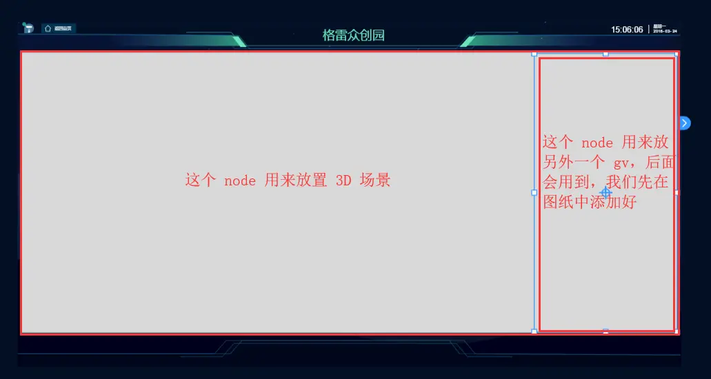 首先我搭建了一个 2D 的场景用来放置我们的 json 矢量图,利用 ht.Default.xhrLoad 函数将 json 矢量背景图反序列化显示在 gv 上,这个 json 矢量背景图中除了作为背景的 node 还有另外两个节点,如下图,红线框起来的比较大的这个节点是用来装 3D 场景的,而右边框起来的比较小的节点是用来放置另外一个 gv 的(暂时还用不到,后期需要添加类似 form 表单的功能,所以我需要固定位置):