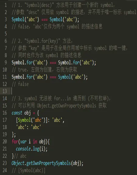 symbol 存在全局作用域,利用 Symbol.for(key) 方法,可以创建(全局作用域无指定键)或获取全局作用域内的 symbol ;利用 Symbol.keyFor(sym) 方法,可以获取指定 symbol 的键