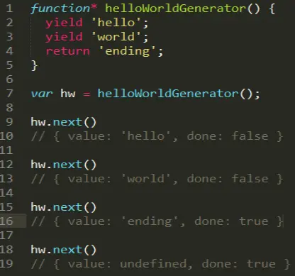 3.形式上,有两个特征。一是,function关键字与函数名之间有一个星号*;二是,函数体内部使用yield语句,定义不同的内部状态(yield在英语里的意思就是“产出”)。