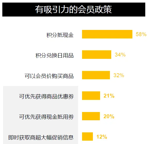 目前商超会员比例53%,其中电子会员占45%,实体卡会员占55%,电子会员是未来趋势,且使用方便是关键利益点