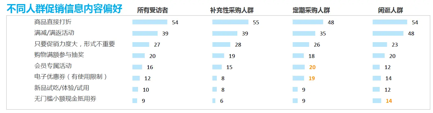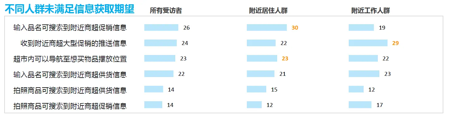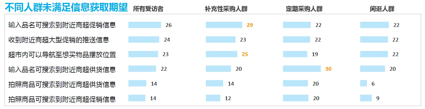 针对场景化促销,购物目的性更强的定期采购人群期望输入品名可搜索到附近商超供货信息,补充性采购人群更希望输入品名可搜索到附近促销信息以及增设店内导航