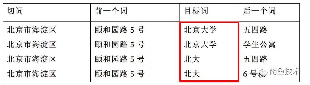 别名目标词定义如下:地点原名称顺序不变的所有子集,并排除一个字和自身。如“北京大学” 可能有{北大,北学,北京大}等10种别名目标词。