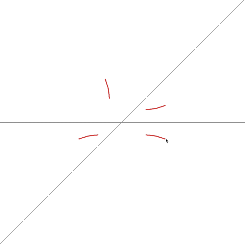 ... function mousemoveHandler (event) { // 得到需要镜像的点(p.x, p.y) let x = e.clientX - (w - canvasWidth) / 2; let y = e.clientY - (h - canvasHeight) / 2; // 得到镜像之后点的(Px,Py) calcSymmetryPoint({x: axleX.start.x, y: axleX.start.y}, {x: axleX.end.x, y: axleX.end.y}, {x: x, y: y}); calcSymmetryPoint({x: axleY.start.x, y: axleY.start.y}, {x: axleY.end.x, y: axleY.end.y}, {x: x, y: y}); calcSymmetryPoint({x: axle.start.x, y: axle.start.y}, {x: axle.end.x, y: axle.end.y}, {x: x, y: y}); // 绘制.. // ctx.beginPath(); // ctx.moveTo(...); // ctx.lineTo(...); // ctx.stroke(); } ...效果演示如下: