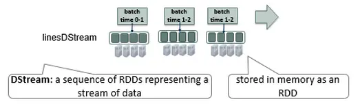 val linesDStream = ssc . textFileStream ( "/user/user01/stream" )linesDStream代表数据流,每个记录都是一行文本。内部DStream是一系列RDD,每个批处理间隔一个RDD。