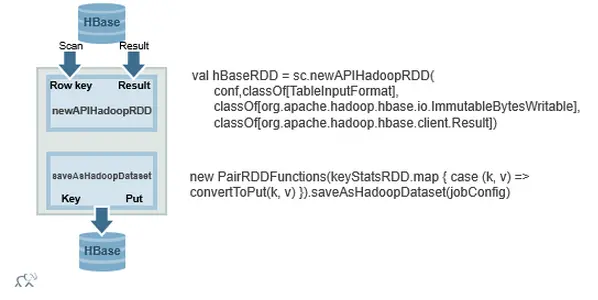 keyStatsRDD.map { case (k, v) => convertToPut(k, v)}.saveAsHadoopDataset(jobConfig)下图显示newAPIHadoopRDD的输出。PairRDDFunctions saveAsHadoopDataset将Put对象保存到HBase。