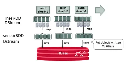 接下来,我们使用DStream foreachRDD方法将处理应用于此DStream中的每个RDD。我们过滤低psi传感器对象以创建警报,然后我们通过将传感器和警报数据转换为Put对象并使用PairRDDFunctions saveAsHadoopDataset方法将传感器和警报数据写入HBase ,该方法使用Hadoop将RDD输出到任何支持Hadoop的存储系统,该存储系统的配置对象(请参阅上面的HBase的Hadoop配置)。