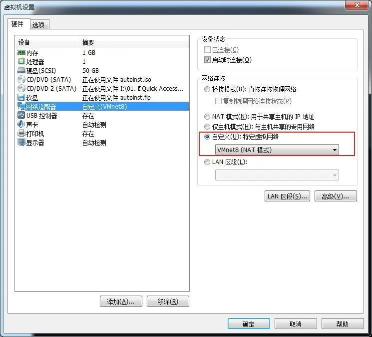 选择网络适配器,然后确定网络连接选中的是“自定义”中的VMnet8(NAT模式):