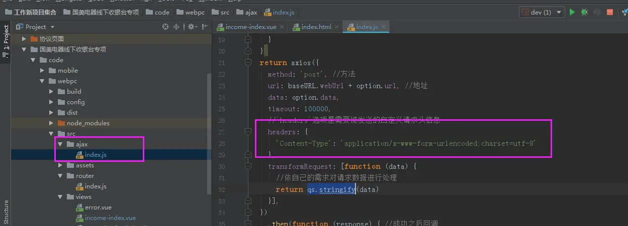 1:最近做vue-cli项目的时候,后台同事说传给他的报文中文全是乱码,设置格式如下: