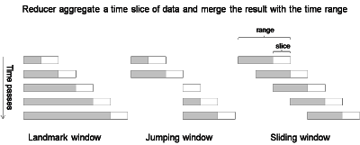 请注意,reducer需要在收到所有mapper中相同时间片的所有记录后计算聚合片值。之后,它会调用用户定义的merge()函数将切片值与范围值合并。如果范围需要刷新(例如达到跳转窗口边界),将调用init()函数来获取刷新的范围值。如果范围值需要更新(当某个切片值超出滑动范围时),则会调用unmerge()函数。