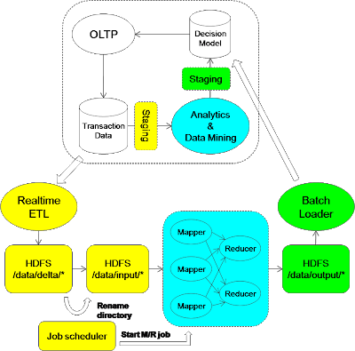 一种方法是根据时间窗(例如每小时)将数据分成小批量,并将每批中收集的数据提交给Map/Reduce作业。这需要分段机制,以便OLTP应用程序可以继续独立于分析处理。而作业调度程序用于规范生产者和消费者,基于此它们每个生产者或消费者都可以独立进行。(生产者和消费者是在操作系统理论中对产生数据和处理数据的程序的称呼,译者注)
