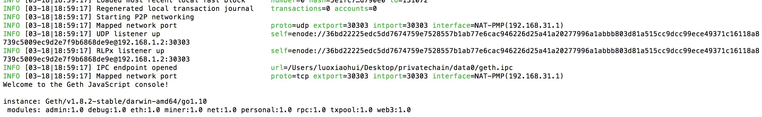 运行上面的命令后,就启动了区块链节点并进入了Javascript Console: