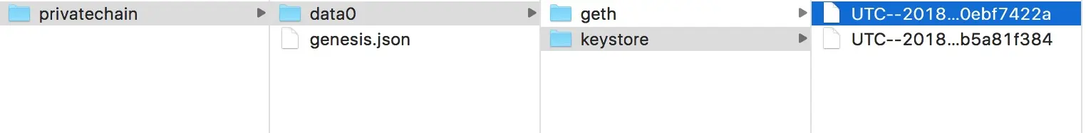 账户默认会保存在数据目录的keystore文件夹中。查看目录结构,发现data0/keystore中多了两个文件,这两个文件就对应刚才创建的两个账户,这是json格式的文本文件,可以打开查看,里面存的是私钥经过密码加密后的信息。