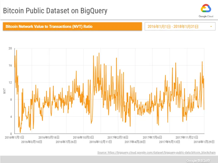 以下根据根据区块链网络的第一原则,网络价值与交易比或 NVT 比制定的评估指标。该图表显示了随时间的每日 NVT 比率: