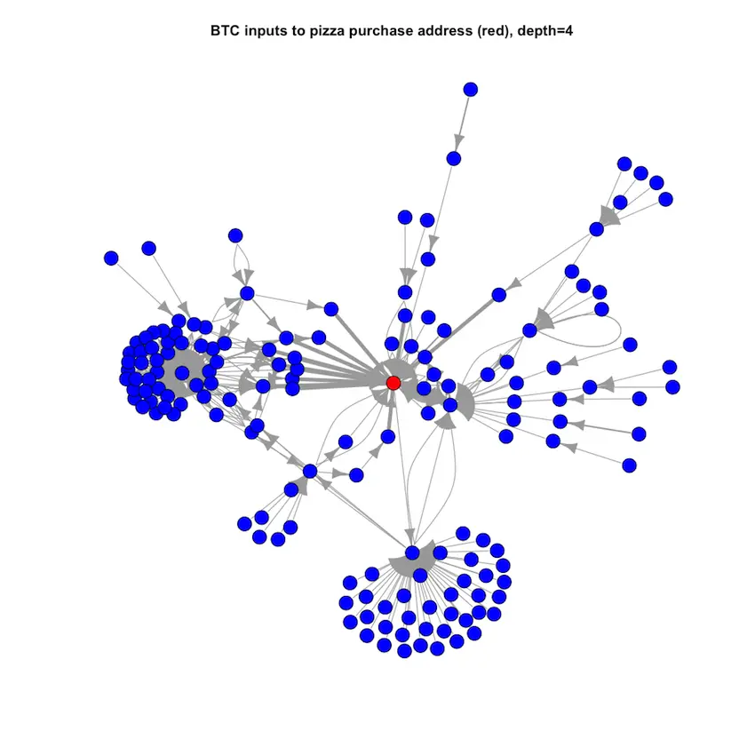 使用电子货币进行交易的一个后果是交易记录公开且完备。据信,第一次用比特币购买物品是在 2010 年 5 月 17 日。Laszlo Hanyecz 花了 10,000 BTC 买了两个批萨,从地址 1XPT…rvH4 到地址 17Sk…xFyQ 的交易记录在交易 ID 为 a107…d48d 的区块链中。我们对 Hanyecz 地址购买批萨之前的 4 层比特币转移数据进行了可视化分析。我们用这段代码生成了下图。Hanyecz 的付款地址为红色圆圈,而其他地址为蓝色圆圈。箭头表示披萨购买交易之前比特币流动的方向。笔画宽度大致与地址间比特币移动量成正比。