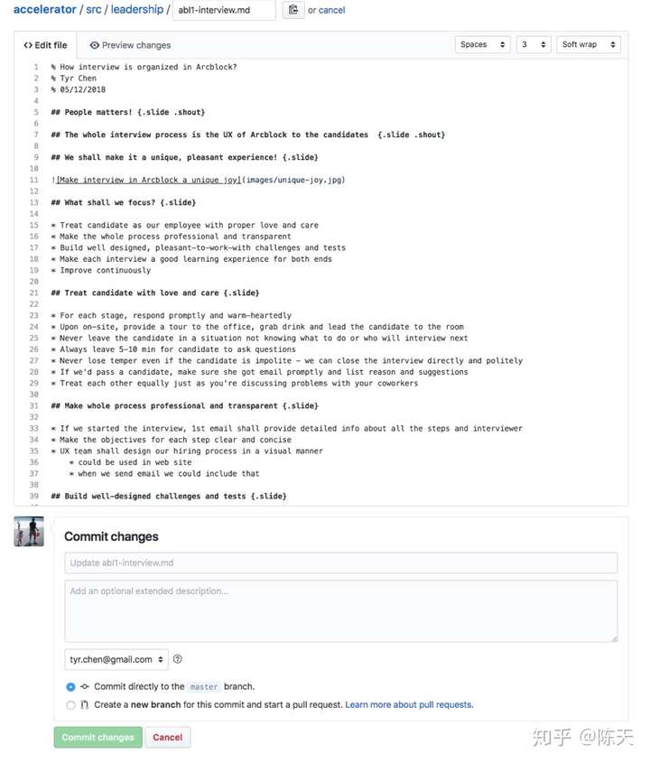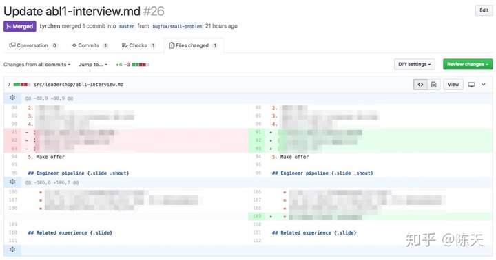 当然,还有代码的最大的好处:快速迭代。当我发现问题后,就可以立刻修改并且发送 pull request,让同事参与进来讨论。我们前几天完成了 interview process 的流程的制定,昨天讨论之后,就有一些 PR 发出来:
