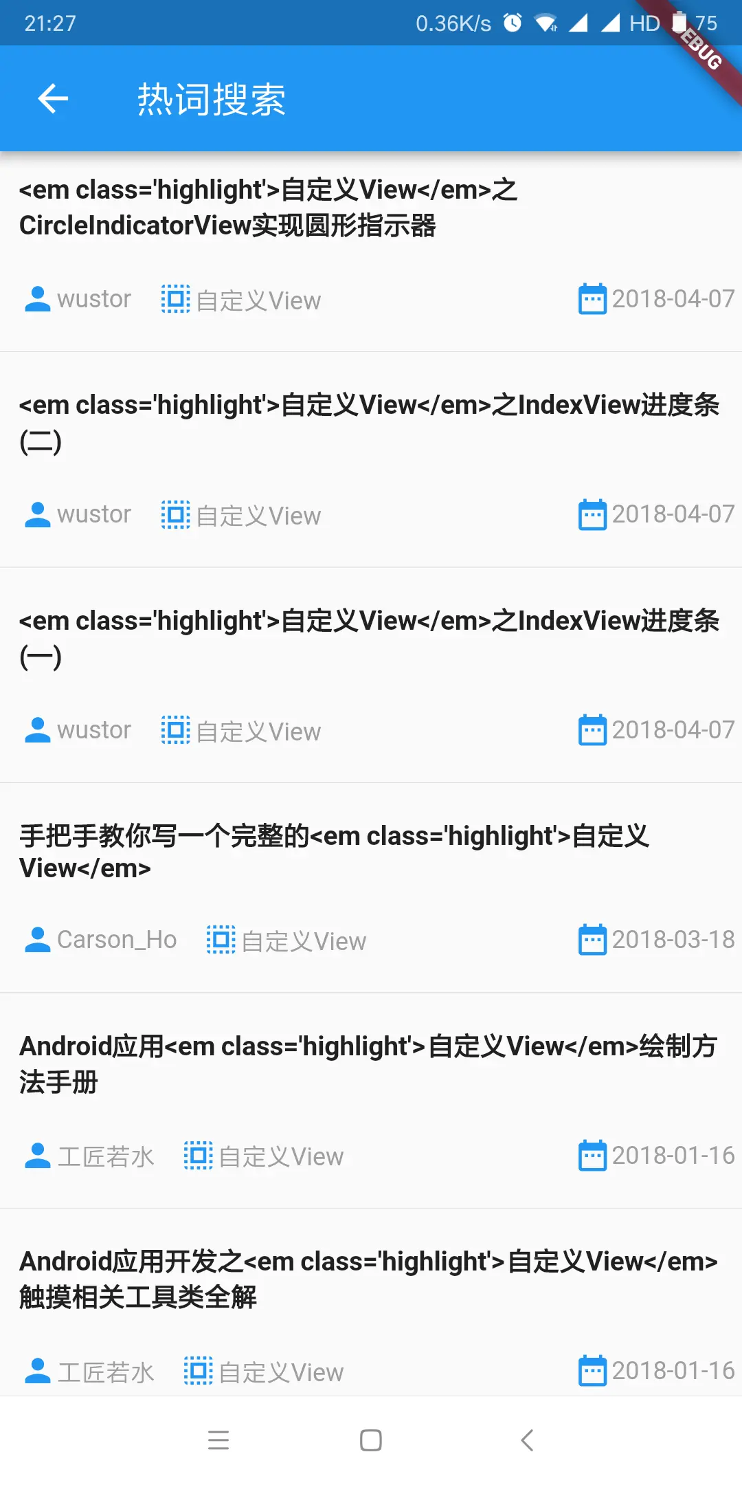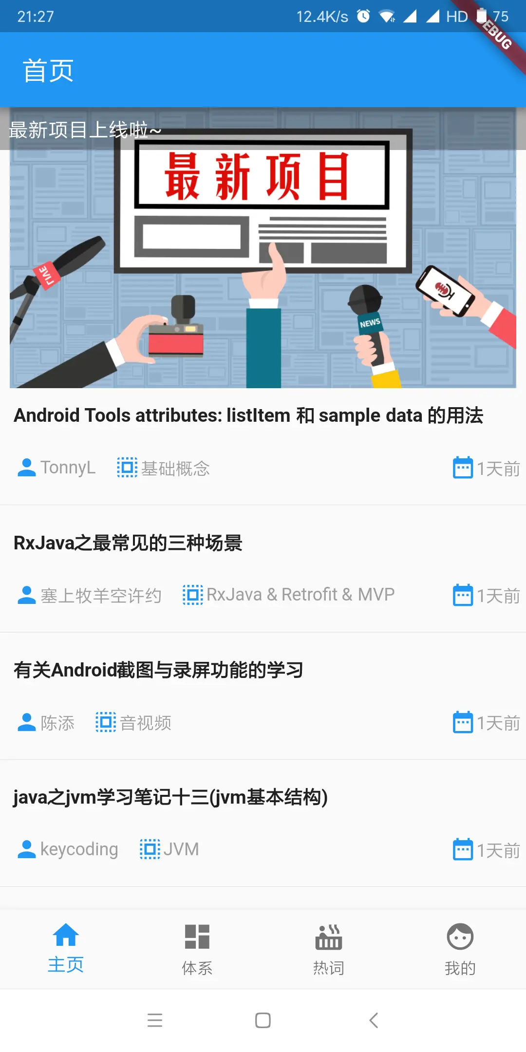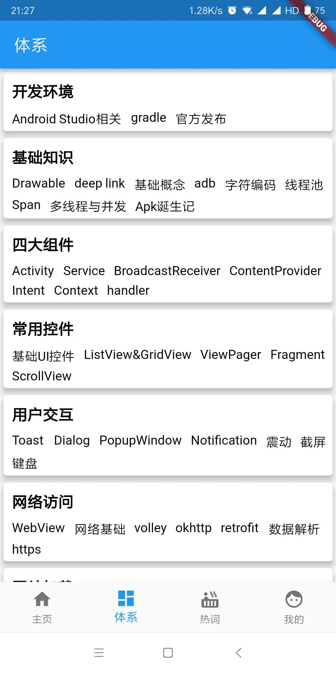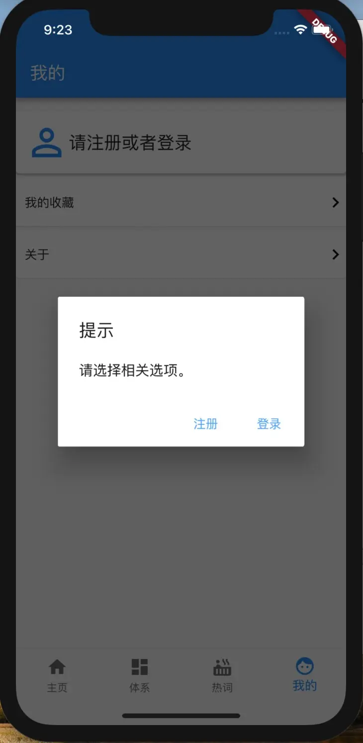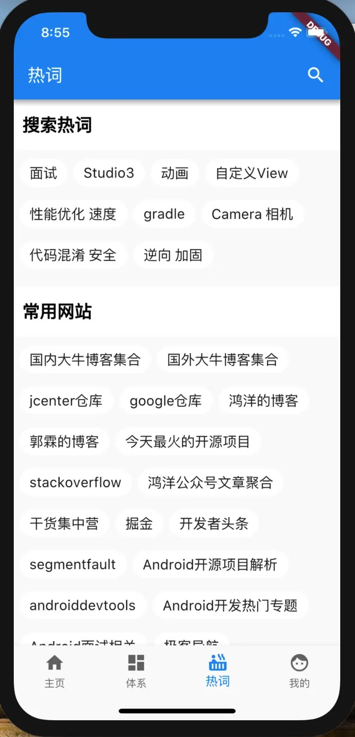 首页分为了主要的文章列表和banner,当用户点击文章列表和banner时会进入到文章详情页面;体系区分了文章的类型列表,主要为一级分类目录和二级分类目录,当用户点击分类列表时会跳转到另一个界面,该界面展示效果和Tablayout和Viewpager组合的相关类似,每个都展示的通过二级目录筛选的文章列表,点击文章列表会跳转到文章详情;热词分为了常搜的热词和常用的网站两类,常搜热词的列表item点击会进入到常搜热词文章列表界面,点击文章会进入到文章详情,常用网站的列表item点击会直接进入文章详情界面;我的主要罗列了注册、登录、我的收藏和关于功能,当用户注册或者登录获取到用户数据的时候会通过sharePreferences存储数据,点击我的收藏会展示用户收藏文章列表,点击文章列表会进入文章详情;当用户没有登录时点击我的收藏会提示用户注册或登录。