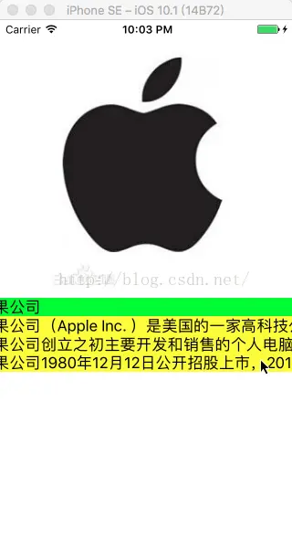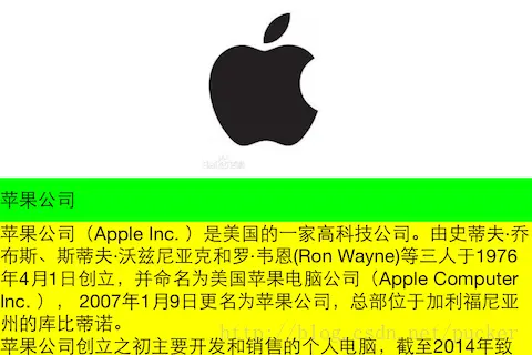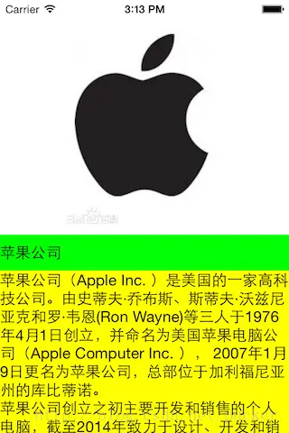本系列文章将以一个简单的例子来演示如何使用这几种方式添加约束,如下图所示。程序的界面主要有三部分组成,最上面是一张苹果logo图片,下面是可以滚动的区域,包含公司名称和详细介绍。竖屏: