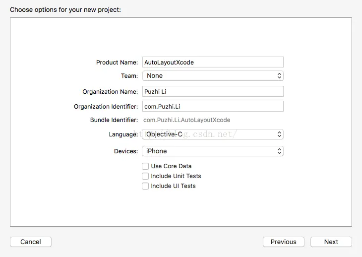 项目命名为AutoLayoutXcode,语言选择Objective-C,设备选择Universal。