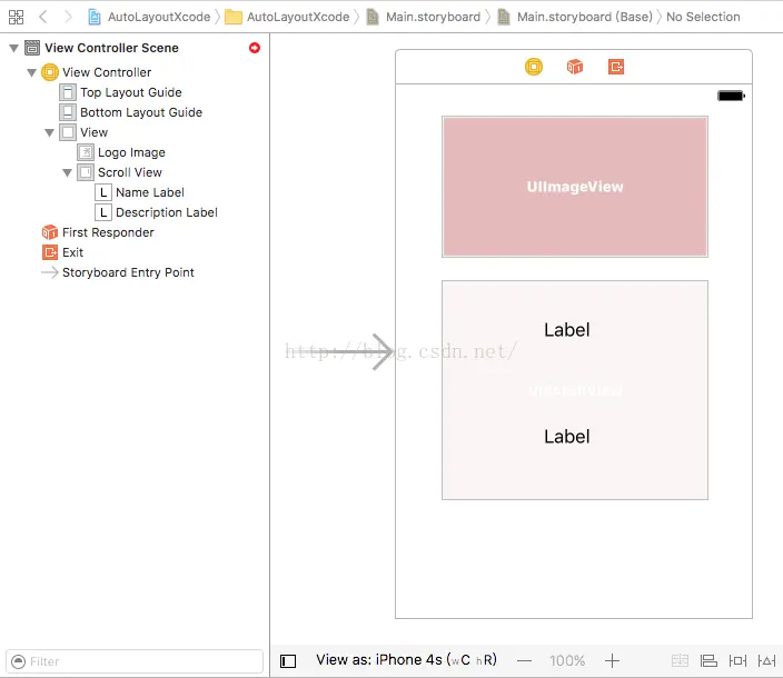 点击Main.storyboard,拖入一个Image View,一个Scroll View以及两个Label,并将两个Label作为ScrollView的子视图。为了便于识别,将Image View的名称改为Logo Image,两个Label的名称修改为Name Label与Description Label。