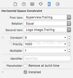 图中的Horizontal Space Constraint表示当前约束是一个水平间距约束;如果是垂直间距约束,则此处显示Vertical Space Constraint。First Item对应公式中的y,表示因变量,这里显示的是Superview.Trailing表示父视图尾部。Relation对应公式中的=,表示相等关系,这里显示的是Equal即相等(这里为什么会有下拉菜单?点开你会发现,除了=之外,还可以设置为>=或者<=,我们以后再详细讲解)。Second Item对应公式中的x,表示自变量,这里显示的是Logo Image.Trailing表示Logo图片的尾部。Multiplier对应公示中的m,表示缩放比例系数,这里的值为1。Constant对应公示中的c,表示偏移常量,这里的值为0。所以完整串下来就很清楚地表达了父视图尾部与图片尾部对齐这样一个关系。