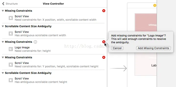我们现在仅为Logo Image添加了3个约束,还缺少确定图片最下面位置的约束,即图中所指出的缺少高度约束(Missing Constraints/Logo Image/Need constraints for: height)。类似于这种缺少约束而导致的错误,被称作“二义性错误”(Ambiguity Error)。此时如果点击Add Missing Constraints按钮,Xcode会自行添加缺失的约束,但可能并非如我们所愿,甚至造成混乱。因此我们点击Cancel,自己添加约束。