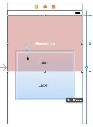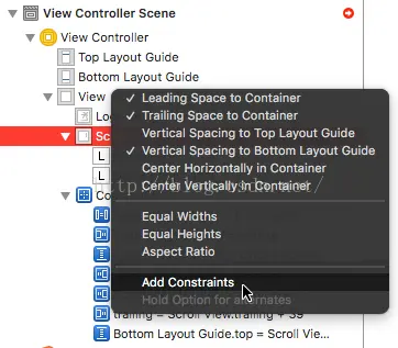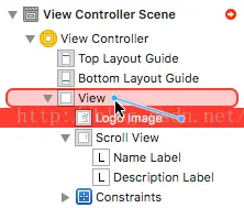 接着建立Scroll View的约束,它与父视图头部、尾部、底部对齐,并且Logo Image与Scroll View的垂直间距为0。除了使用Pin菜单之外,也可以直接在文档结构窗口中或者设计器中通过拖拽建立约束。在文档结构窗口中选中Scroll View,按住control拖拽到其父视图View: