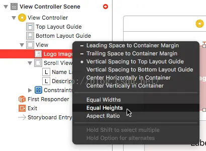 我们希望图片总能够占据上半部分屏幕,因此可以在图片与父视图之间建立高度约束。在文档结构窗口中,鼠标单击选中Logo Image,按住Control键(或者按住鼠标右键)拖拽到其父视图View上。