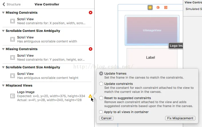 现在Logo Image的4个约束就齐了。由于我们尚未向ScrollView和Label添加约束,所以Storyboard文件还是会报二义性错误,我们先暂时忽略这些错误。注意到Logo Image由错误变成了警告:Misplaced Views/Logo Image/Expected:...
