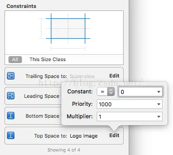 通过拖拽方式建立约束,Xcode会按照视图的当前实际大小来确定约束的常量值,因此需要手动进行修改。在Size Inspector窗口中分别点击每条约束的Edit按钮,将Constant的值改为0。