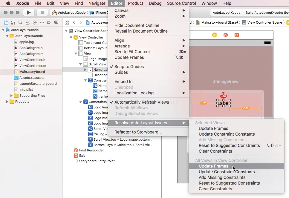 子菜单中分成两部分,上面的只针对当前选中的视图,下面的部分针对界面中的所有视图。我们点击下面的Update Frames以更新位置尺寸。